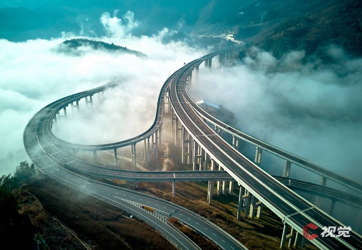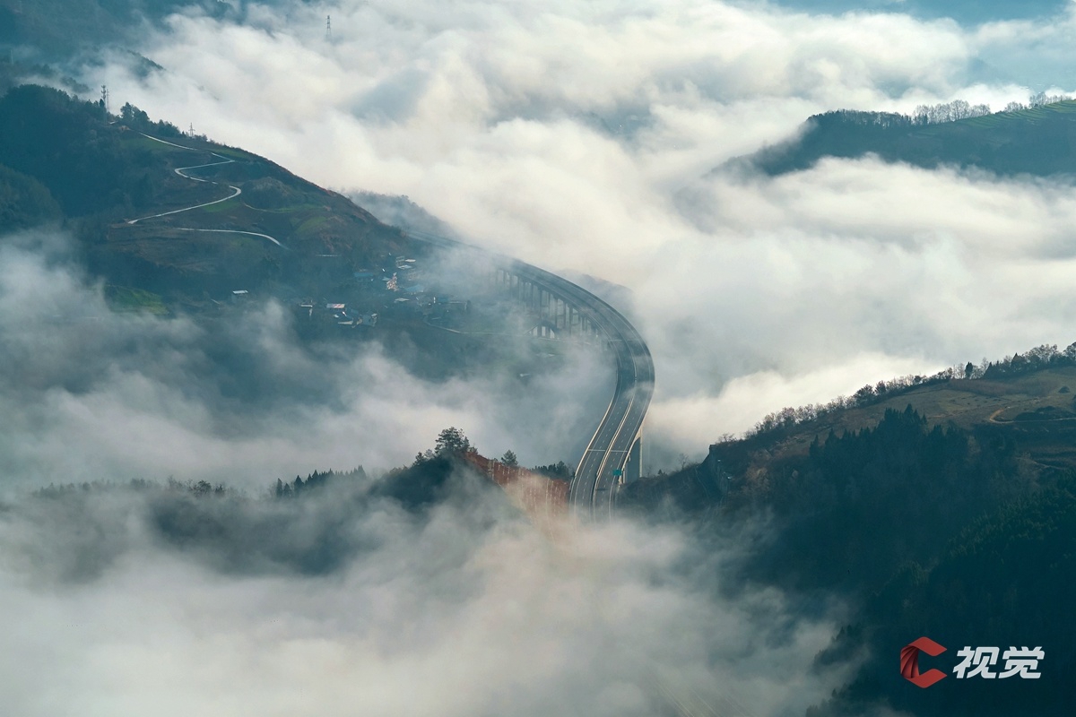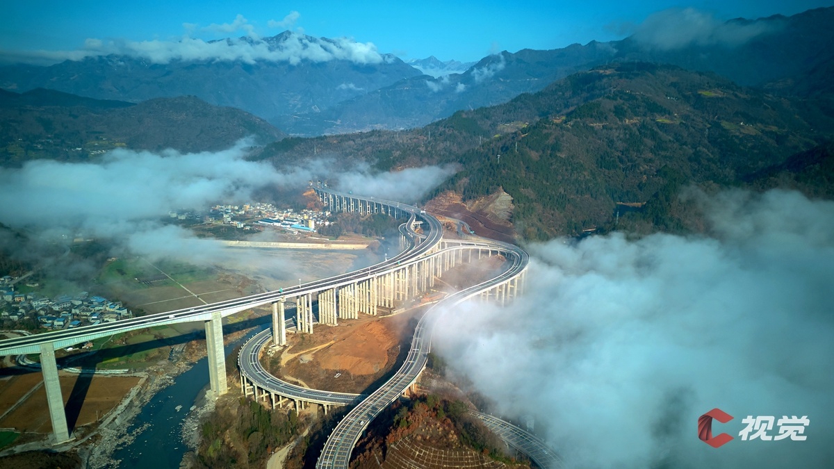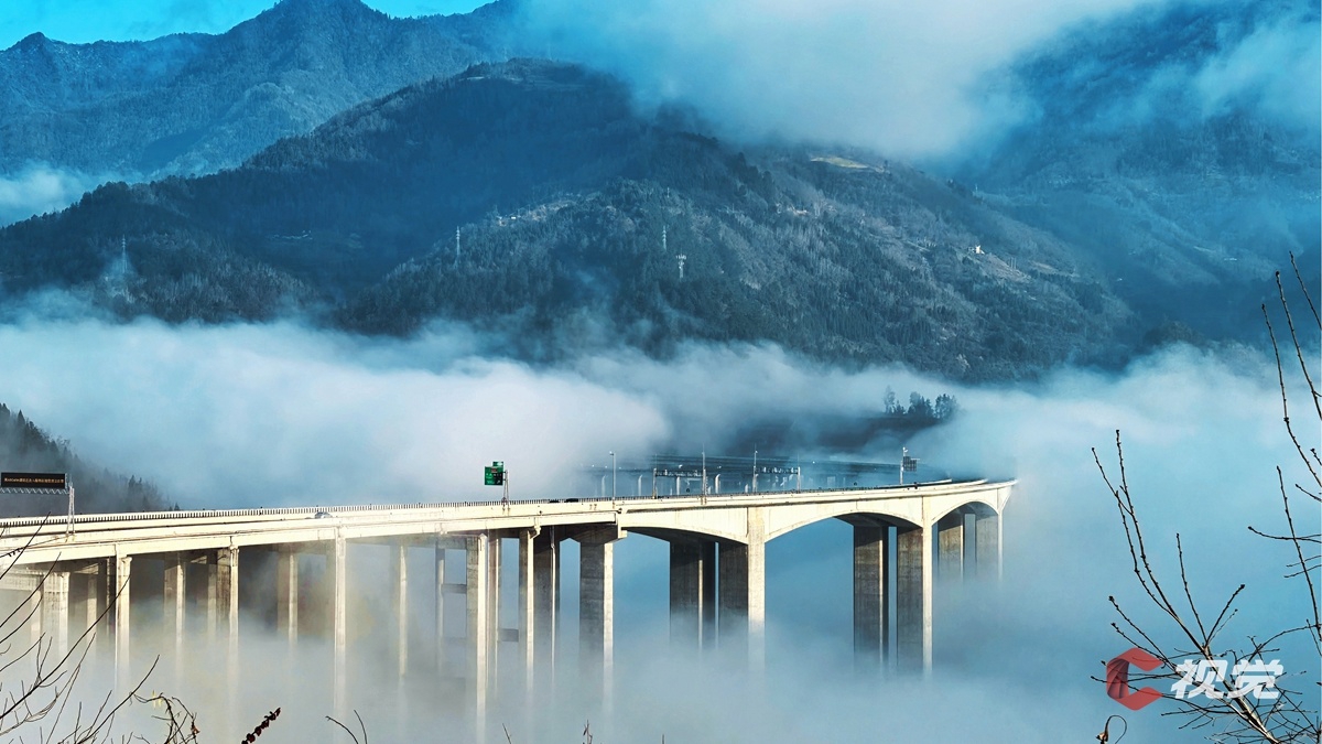 层峦叠嶂,云雾轻飘;高桥飞架,直破云霄。2月26日清晨,一场春雨过后,绵阳市平武县县城放晴,城市周边云雾缭绕。九绵高速平武涪江特大桥再现“云端高速”美景,宛如一条灵动的巨龙,在涌动的云雾间蜿蜒前行,穿梭于群山峻岭之间,壮美无比。