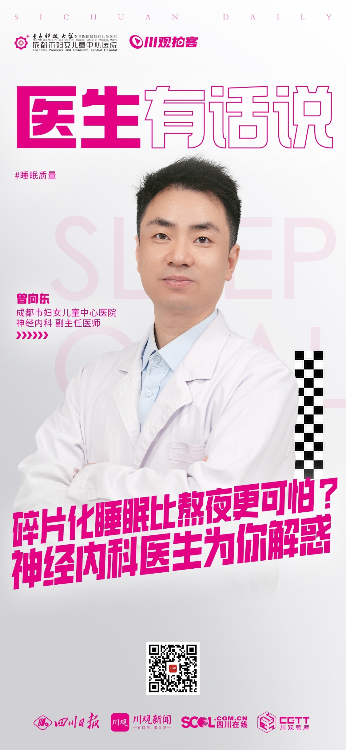 本期栏目,来自成都市妇女儿童中心医院神经内科的副主任医师曾向东,就跟大家说一说碎片化睡眠的成因、对身体健康的影响以及如何改善睡眠。