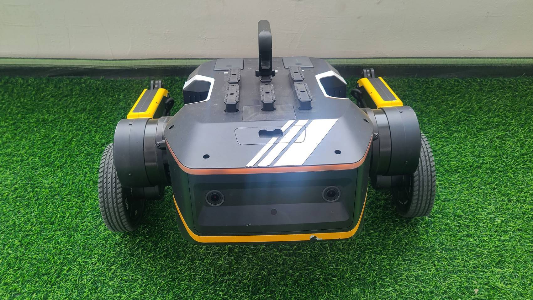现场还有一个“个头”小巧的黑色机器人,样子更像一只黑色的大口蛙。它的腿部是折叠、弯曲的,还可自如地抬升,跑起来轻快、灵巧。“这是我们在买来的底盘上进行了二次开发,功能和‘鹿舟’差不多,只在园区的标准道路上跑,节省费用。”