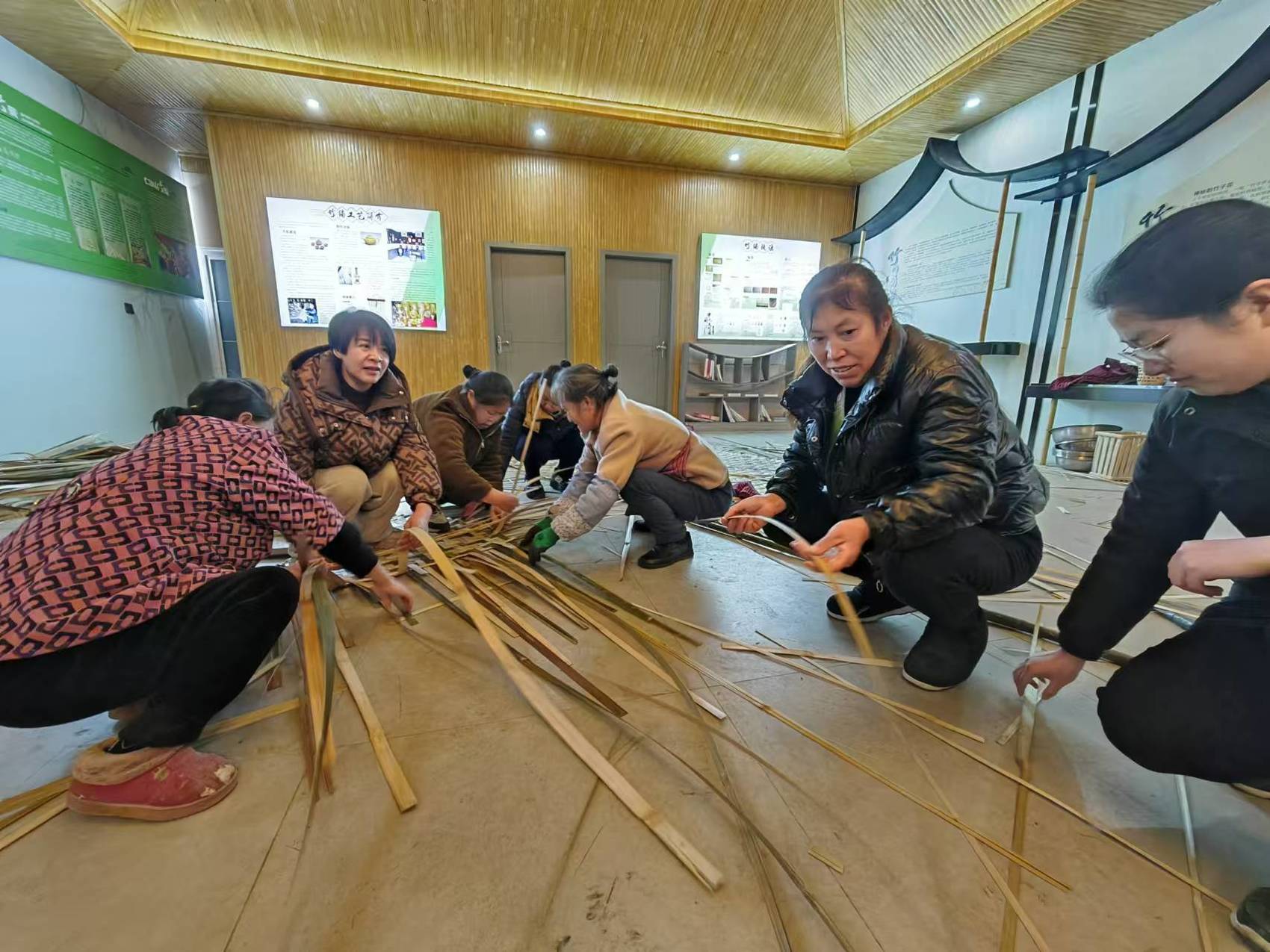 任敏(左二)和村民一起编制竹工艺品。 受访者供图