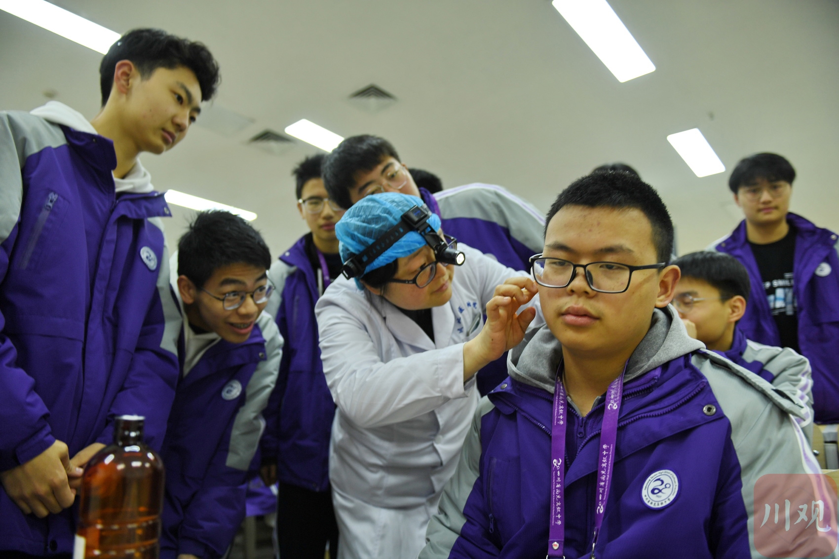 2025年3月1日,在四川省南充高级中学临江校区、川北医学院附属医院耳鼻咽喉头颈外科李蓓副教授(中)为同学们检查耳朵健康情况。