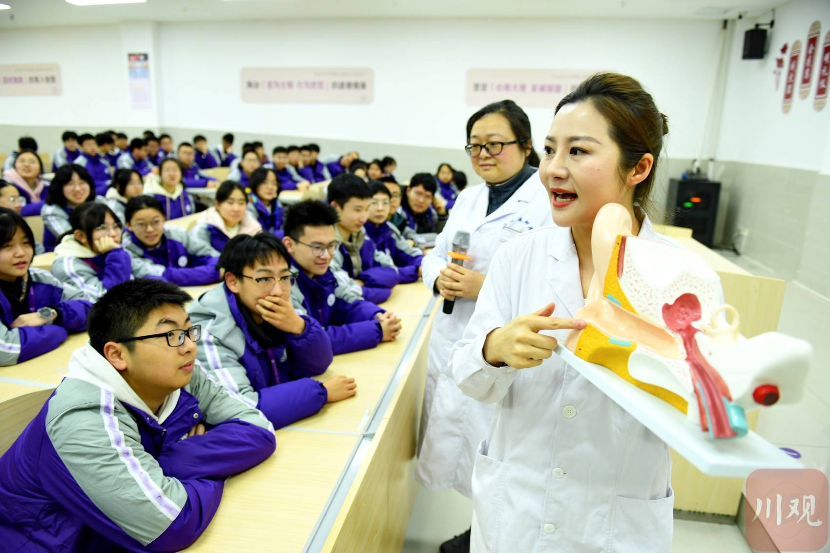 2025年3月1日,在四川省南充高级中学临江校区、川北医学院附属医院耳鼻咽喉头颈外科主治医师潘庆春(中)为同学们讲解耳蜗构造及科学护耳知识。