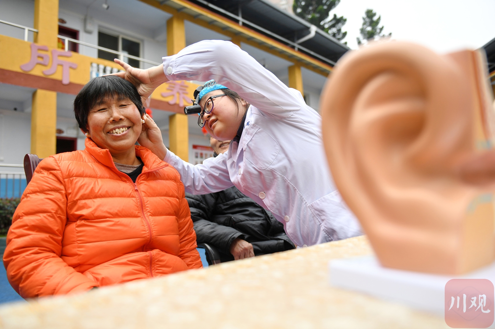 2025年3月1日,在南充市顺庆区五福养老中心,川北医学院附属医院耳鼻咽喉头颈外科李蓓副教授为老人检查耳朵健康情况。