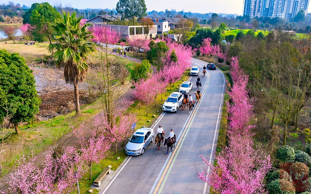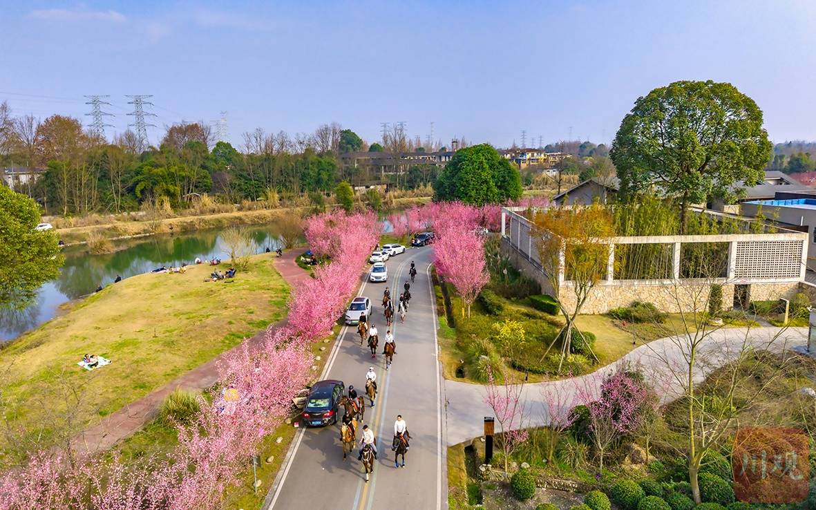 3月 1 日,温江区寿安镇吴家场社区的天鹅湖湖畔,不少市民选择骑马赏梅,或是在景区路上骑行 。