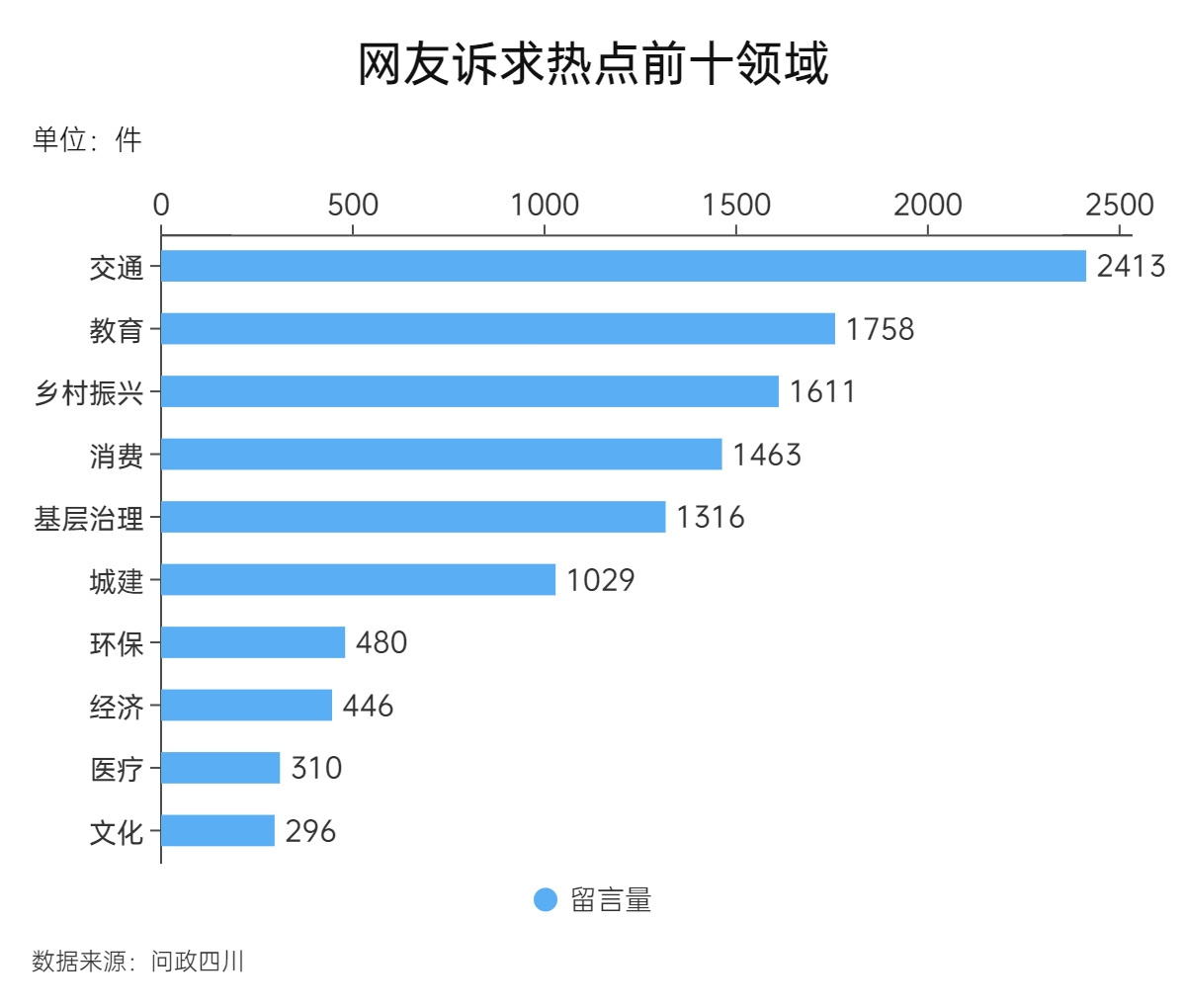 全国两会召开前夕,“问政四川”平台已收到不少网友的留言建议。四川在线记者梳理发现,近一个月来,网友们的关注热点大多聚焦在民生领域,排在前两位的热门话题为交通和教育,相关留言分别占总量的19.97%及14.55%。