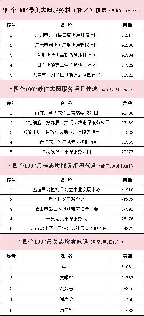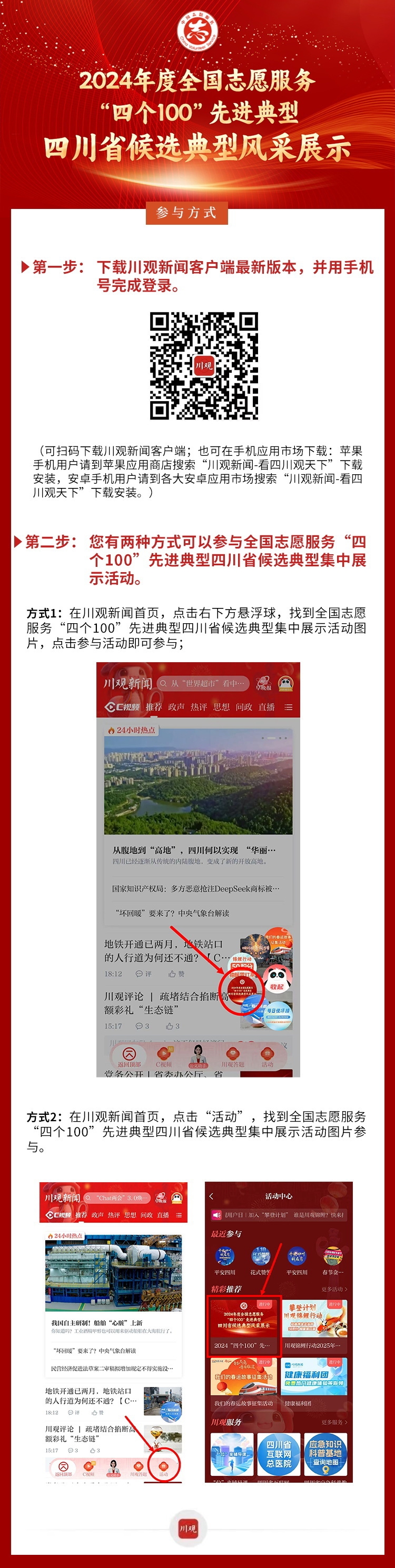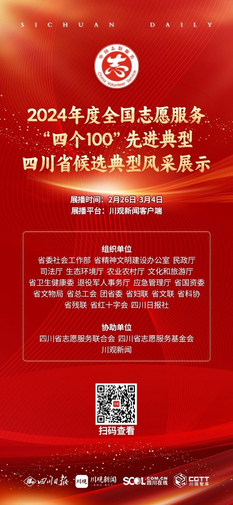 2025年2月26日至3月4日,2024年度全国志愿服务“四个100”先进典型四川省候选典型集中展示专题在川观新闻客户端展播,全省21个市州及省直部门推荐的223个候选典型接受公众点赞送花。截至3月3日16时,活动已吸引超310万次点赞。3月4日24时,点赞通道将正式关闭,快为你心中的志愿榜样再送一朵小红花!