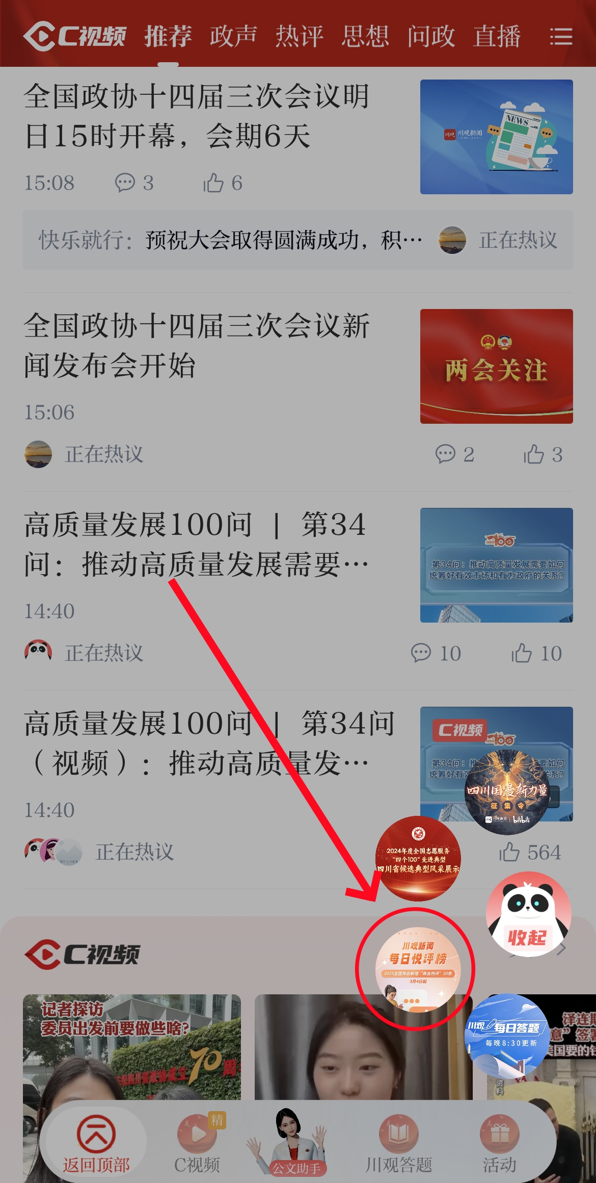 在川观新闻首页,点击右下方悬浮球,找到“每日悦评榜”图片点击即可查看。