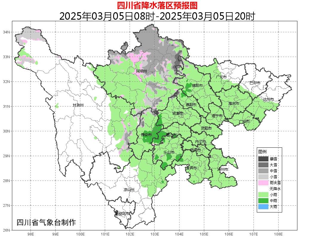 今天晚上:盆地各市阴天,大部地方有小雨,西部局部有中雨,高海拔山区有小到中雪或雨夹雪;阿坝州大部、甘孜州西北部东部和凉山州东北部阴天间多云有阵雪(雨),局部地方有中到大雪,川西高原和攀西地区其余地方多云间晴。
