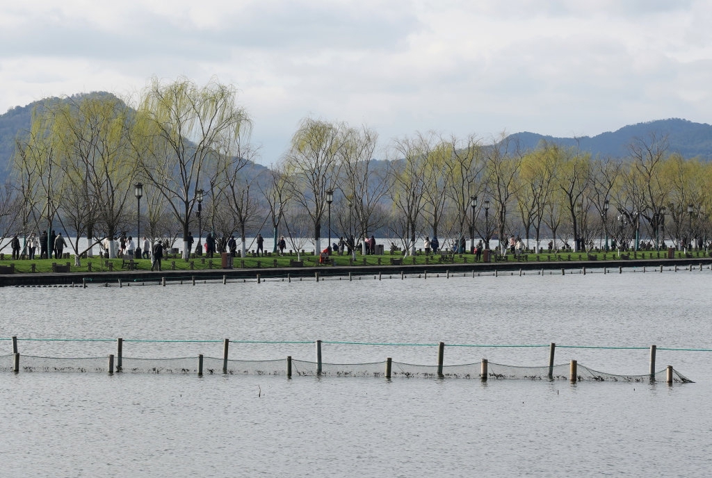 3月4日,游客行走在杭州西湖白堤上。