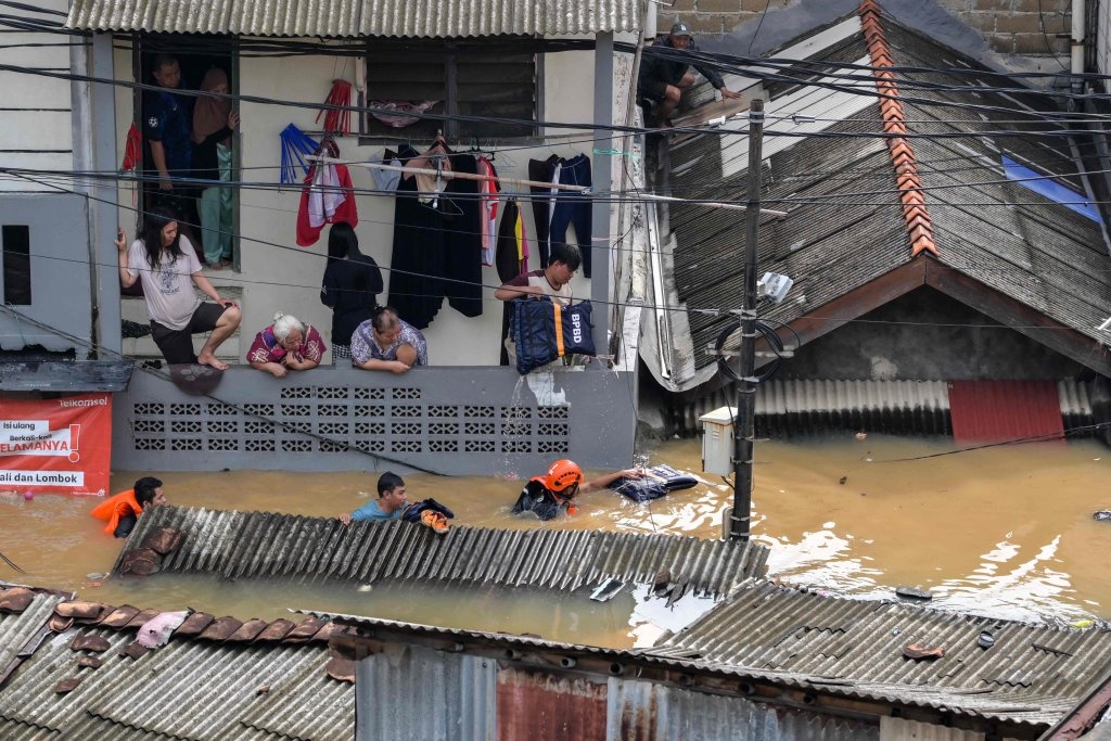 3月4日,在印度尼西亚雅加达,救援人员疏散当地民众(无人机照片)。