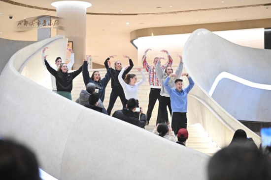 演出开场前,成都城市音乐厅共享大厅内上演了一场别开生面的“复古快闪”。成都本土摇摆舞团“HISWING”与《舞蹈皇后》演出团队,以即兴舞蹈点燃观众热情。音乐厅内开放式的共享空间,为市民提供了近距离参与艺术互动的机会,现场观众从驻足观赏到自发共舞,气氛热烈。