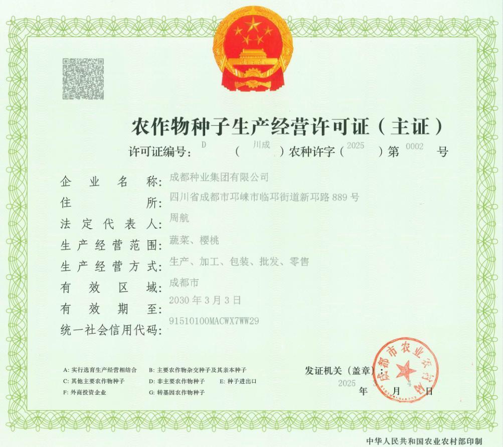 3月5日,四川省首张大蒜种子生产经营许可证在成都市政务中心正式颁发。成都市委农办专职副主任、市农业农村局副局长宋峰为成都种业集团授证,标志着该集团获得蔬菜(含“红七星”“川蒜1号”等7个特色品种)及樱桃种子生产经营资质,填补了省内大蒜种业规范化管理空白。