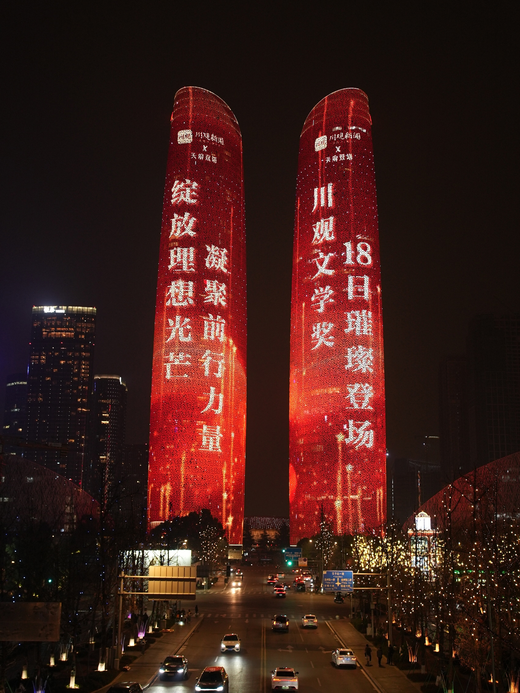 1月17日晚,成都金融城双子塔为川观文学奖亮灯。