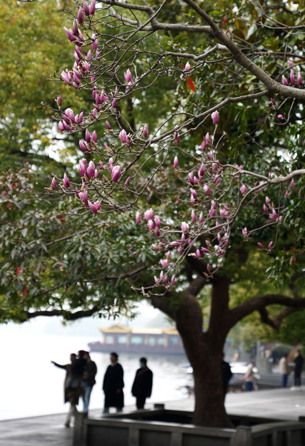 3月10日,游人从杭州西湖边的紫玉兰附近经过。
