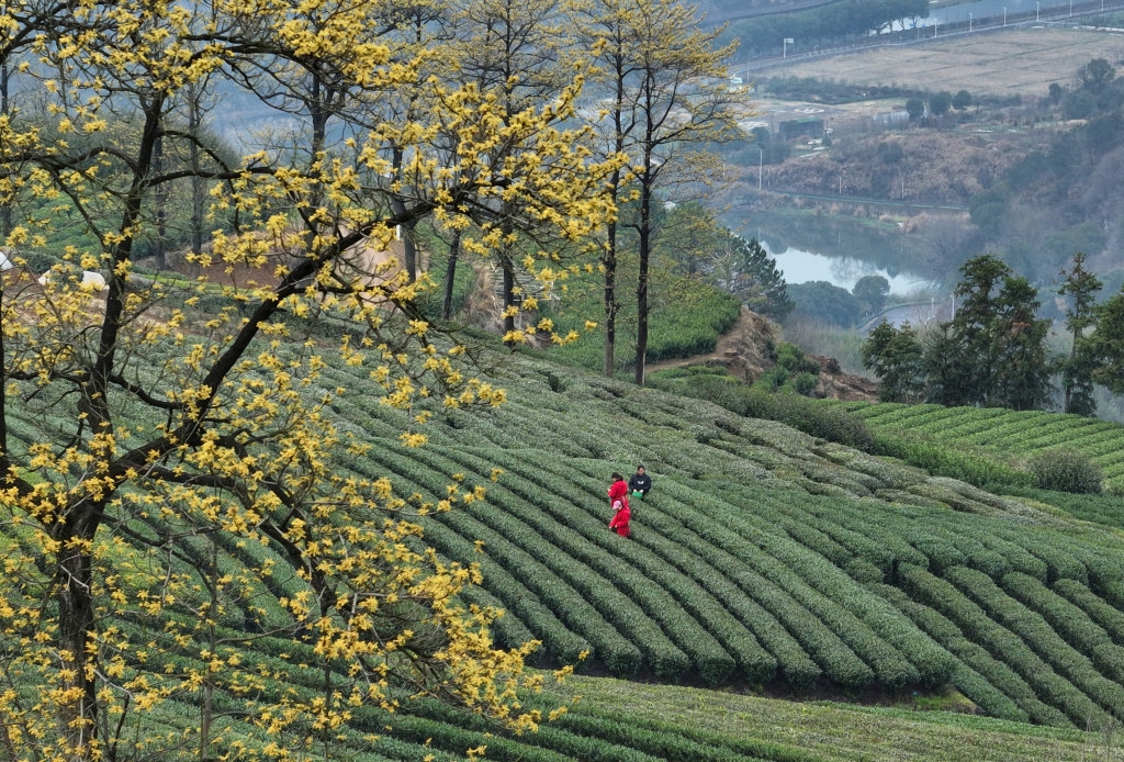 3月10日,茶农在新昌县东茗乡下岩贝村采摘新茶(无人机照片)。