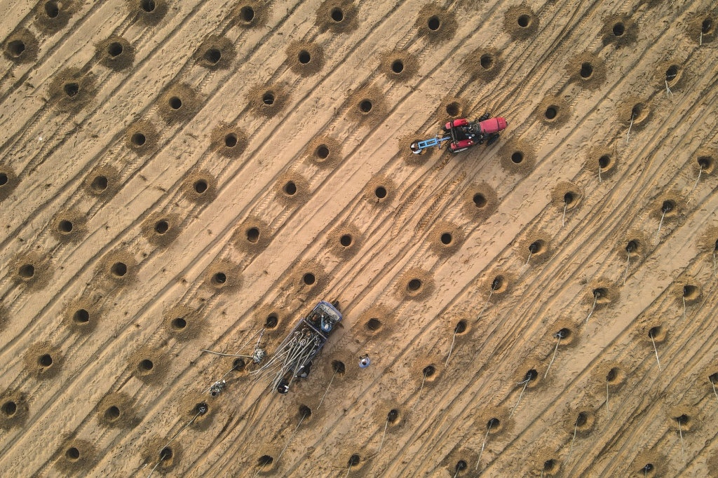 3月10日,工作人员在河南省商丘市梁园区黄河故道森林公园植树(无人机照片)。