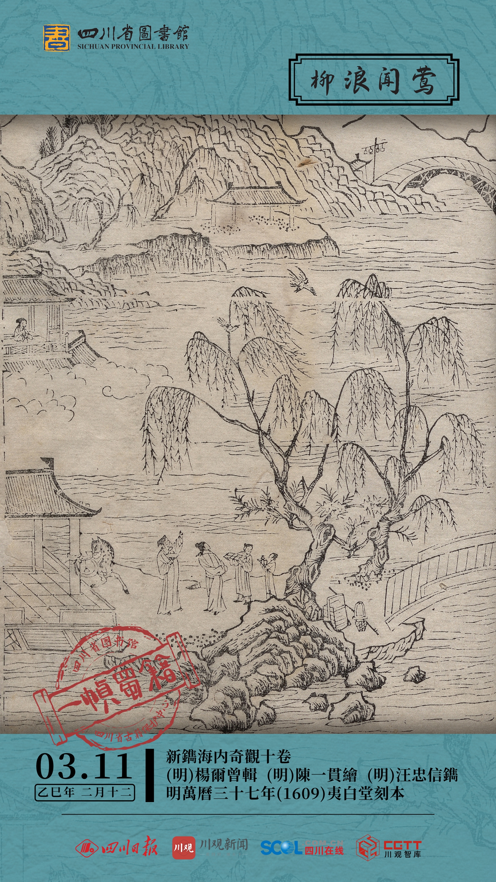3月11日,一帧蜀籍邀您欣赏《新镌海内奇观》。海报所选用图为《新镌海内奇观》十卷,由(明)杨尔曾辑、(明)陈一贯绘、(明)汪忠信镌,版本为明万历三十七年(1609)夷白堂刻本。
