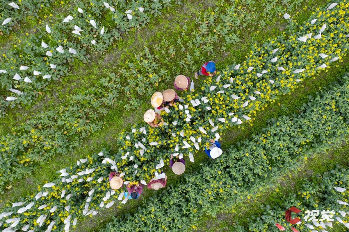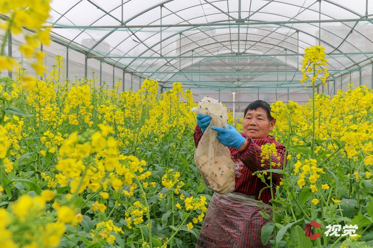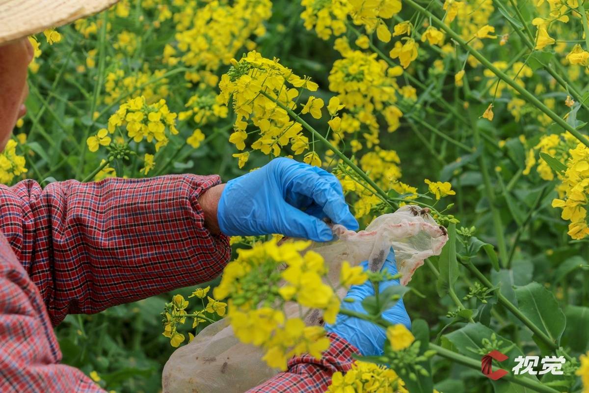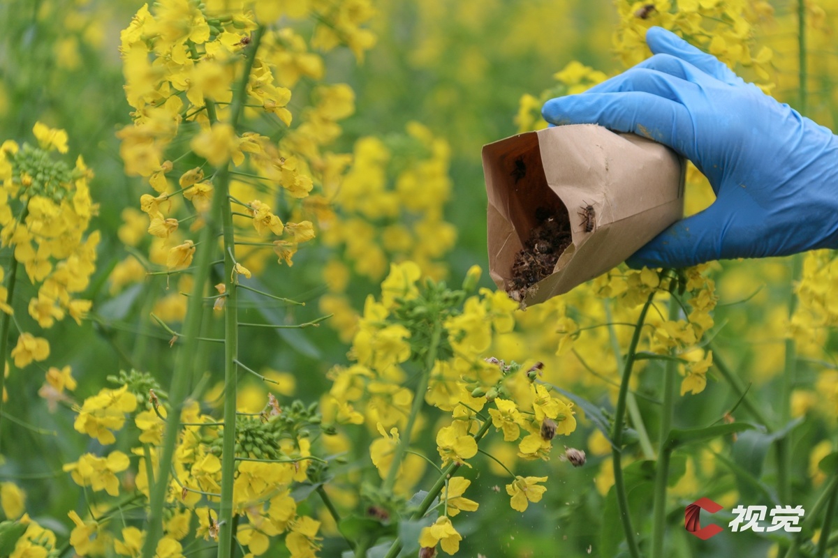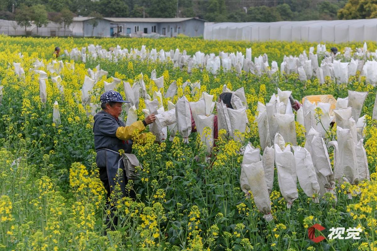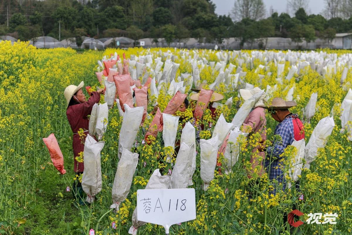3月12日,成都市农林科学院的科研人员与农户在花田里忙着对油菜花进行套袋,并进行放蜂作业。