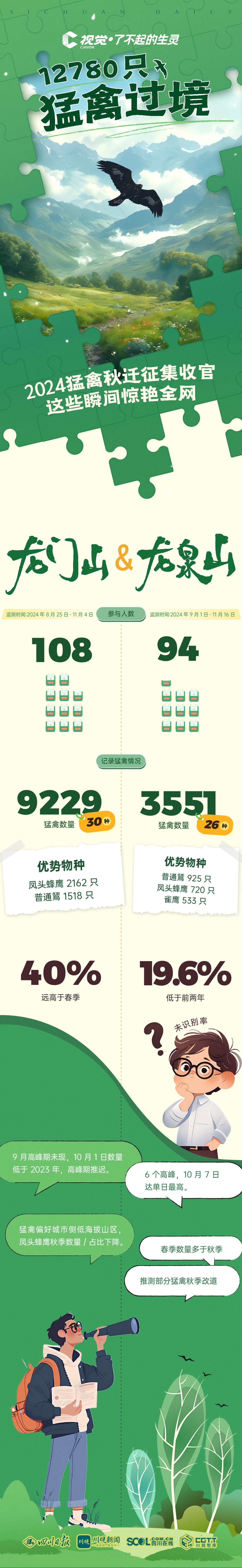 2025年初,经过严谨的统计分析,成都猛禽研究小组、龙门山迁徙猛禽监测与保护项目组于2月底公布数据:成都龙门山与龙泉山在2024年秋季共记录到12780只猛禽,具体数据如下: