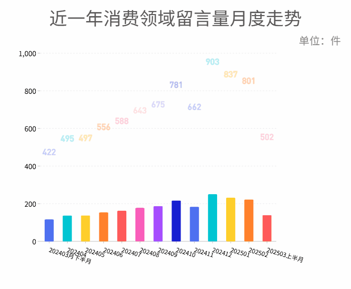 从月度走势来看,一年来最高消费领域诉求量出现在2024年12月,达903件,2025年1月、2025年2月分别紧随其后,相关留言量分别达837件、801件。可见伴随着消费刺激政策持续发力,网友消费积极性不断增强,相关消费纠纷也有所增加。