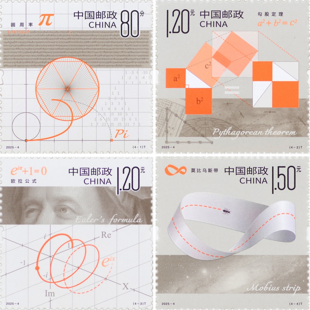 这是《数学之美》特种邮票1套4枚的拼版照片,邮票图案名称为:圆周率、勾股定理、欧拉公式、莫比乌斯带。