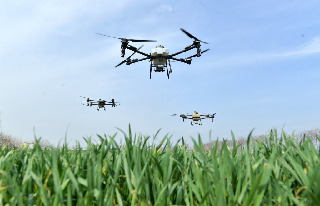 3月13日,在河南省夏邑县圣源果蔬种植专业合作社郭店镇杨吕庙村优质小麦种植基地,无人机在执行植保作业。