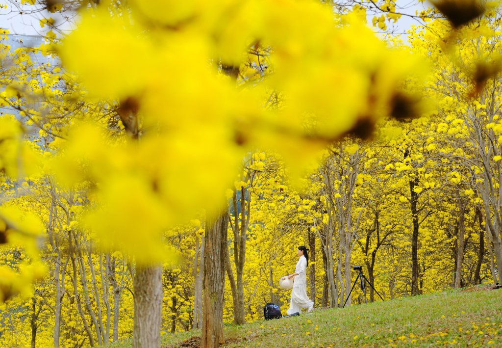 3月14日,游客在广西南宁市青秀山风景区观赏黄花风铃木。