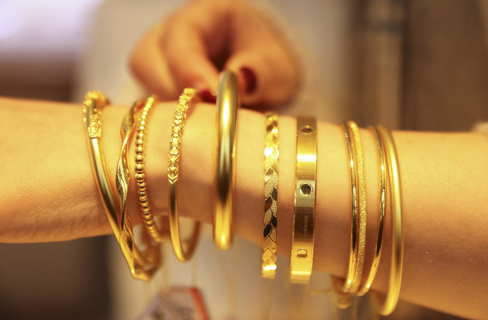 2月11日,在浙江省湖州市德清县乾元镇一家金店,店员展示黄金首饰。新华社发(倪立芳摄)