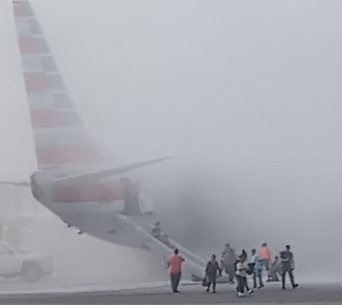 这张3月13日来自社交媒体的视频截图显示,美国航空公司一架客机在美国科罗拉多州丹佛国际机场起火,乘客被紧急疏散。