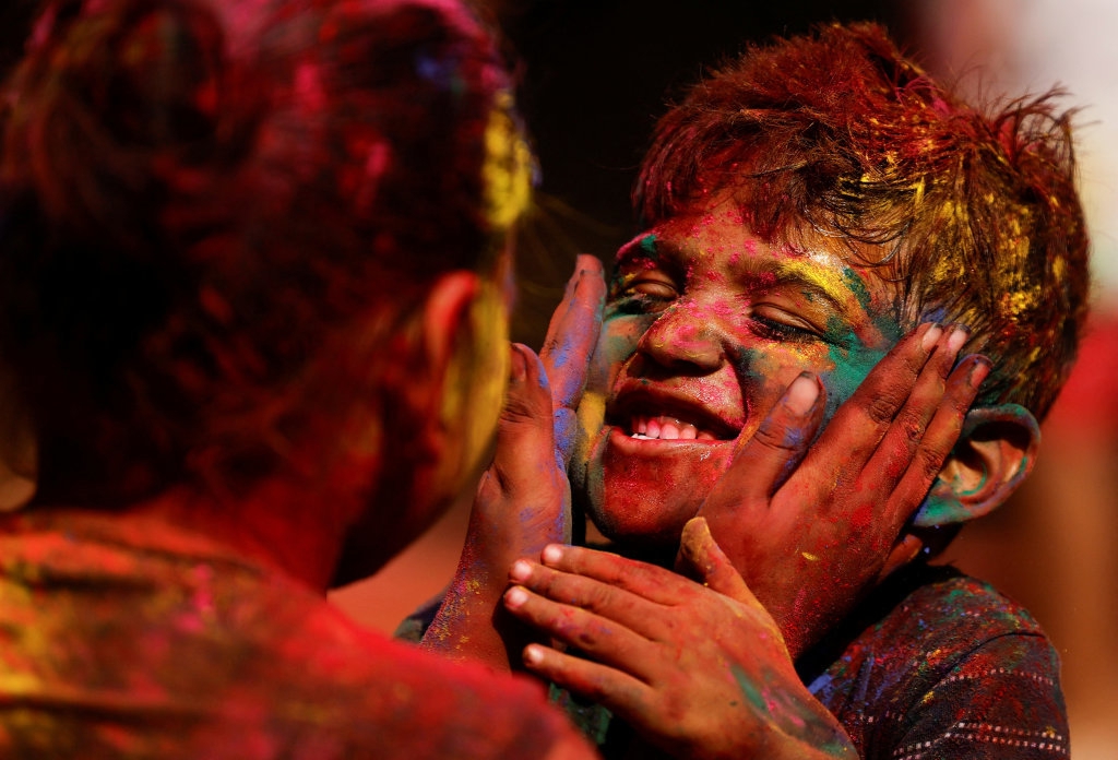 洒红节也叫胡里节,人们在节日期间互相涂抹颜料,迎接春天的到来。