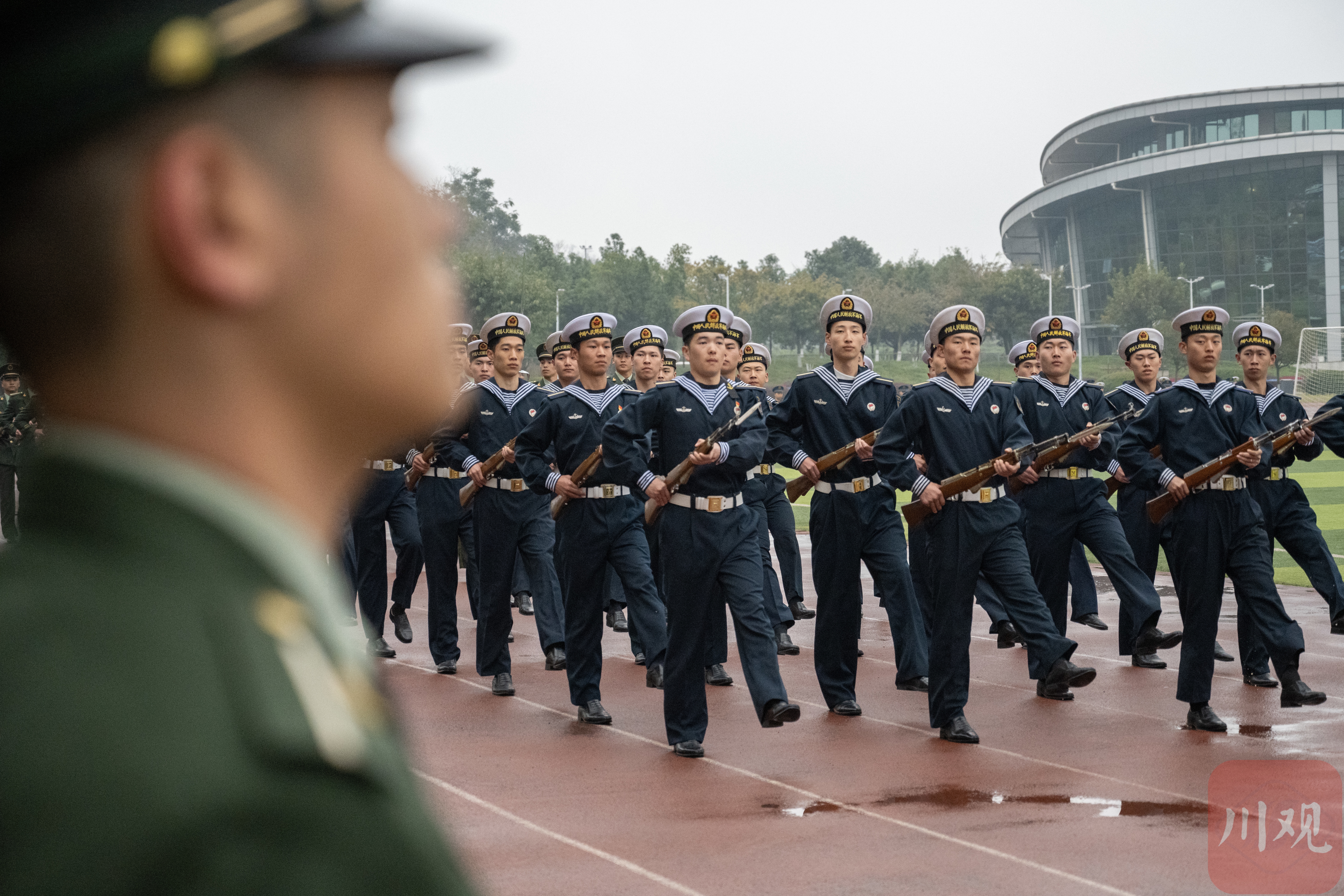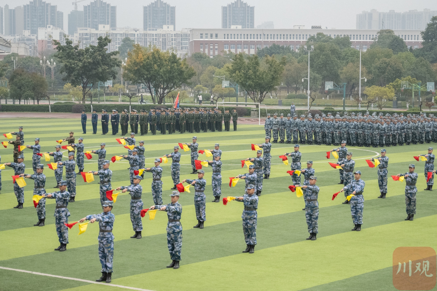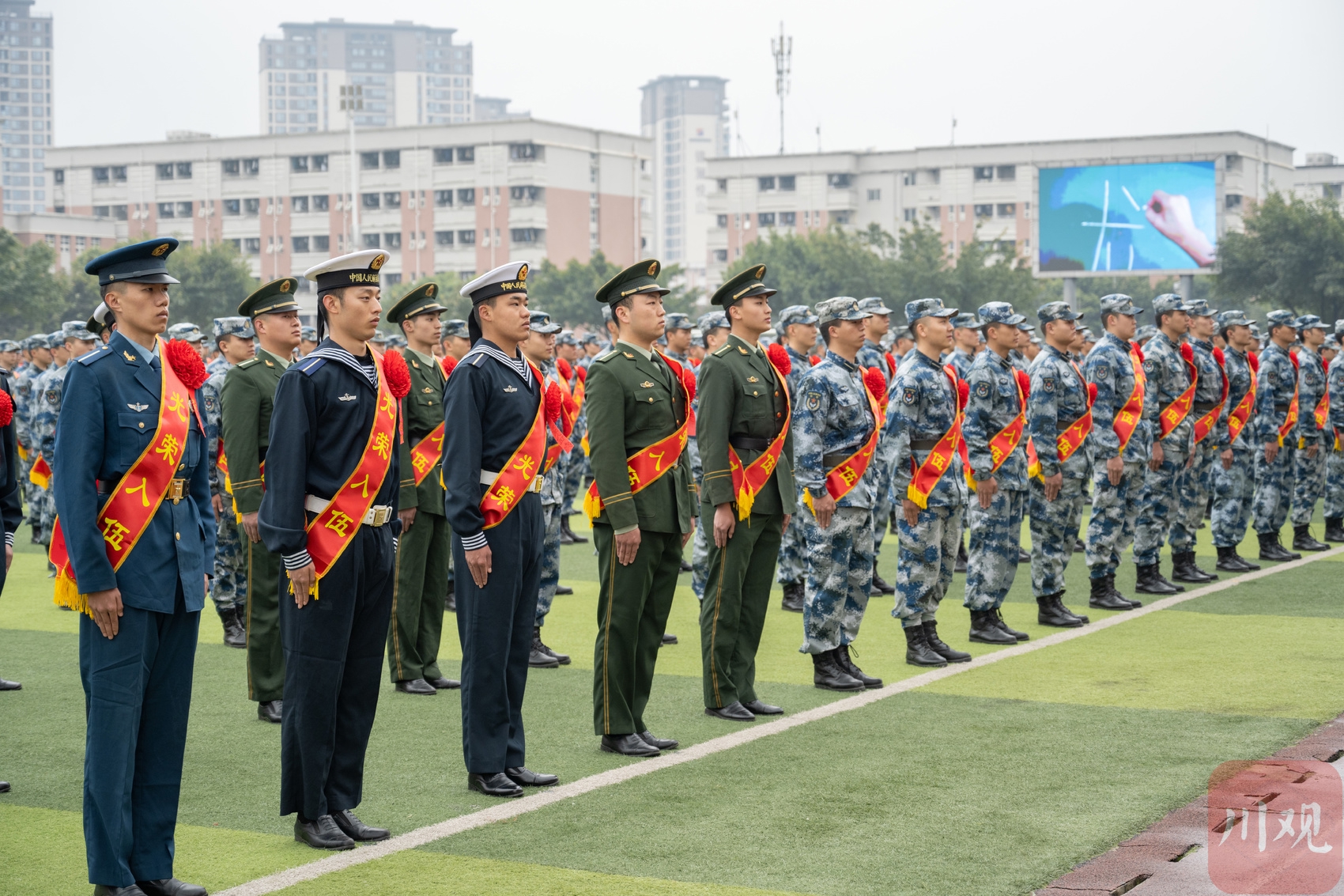 702名军士生身着受训戎装,肩披绶带红花,正式踏上强军报国新征程。