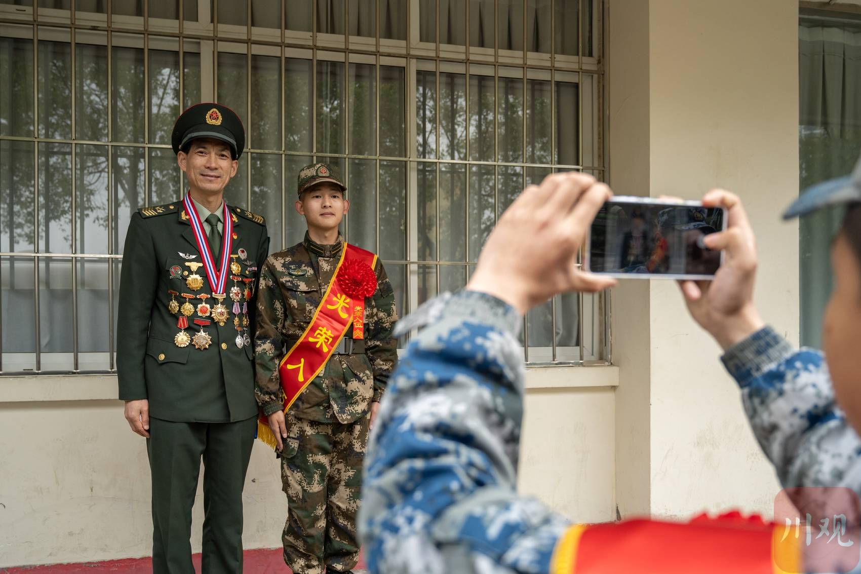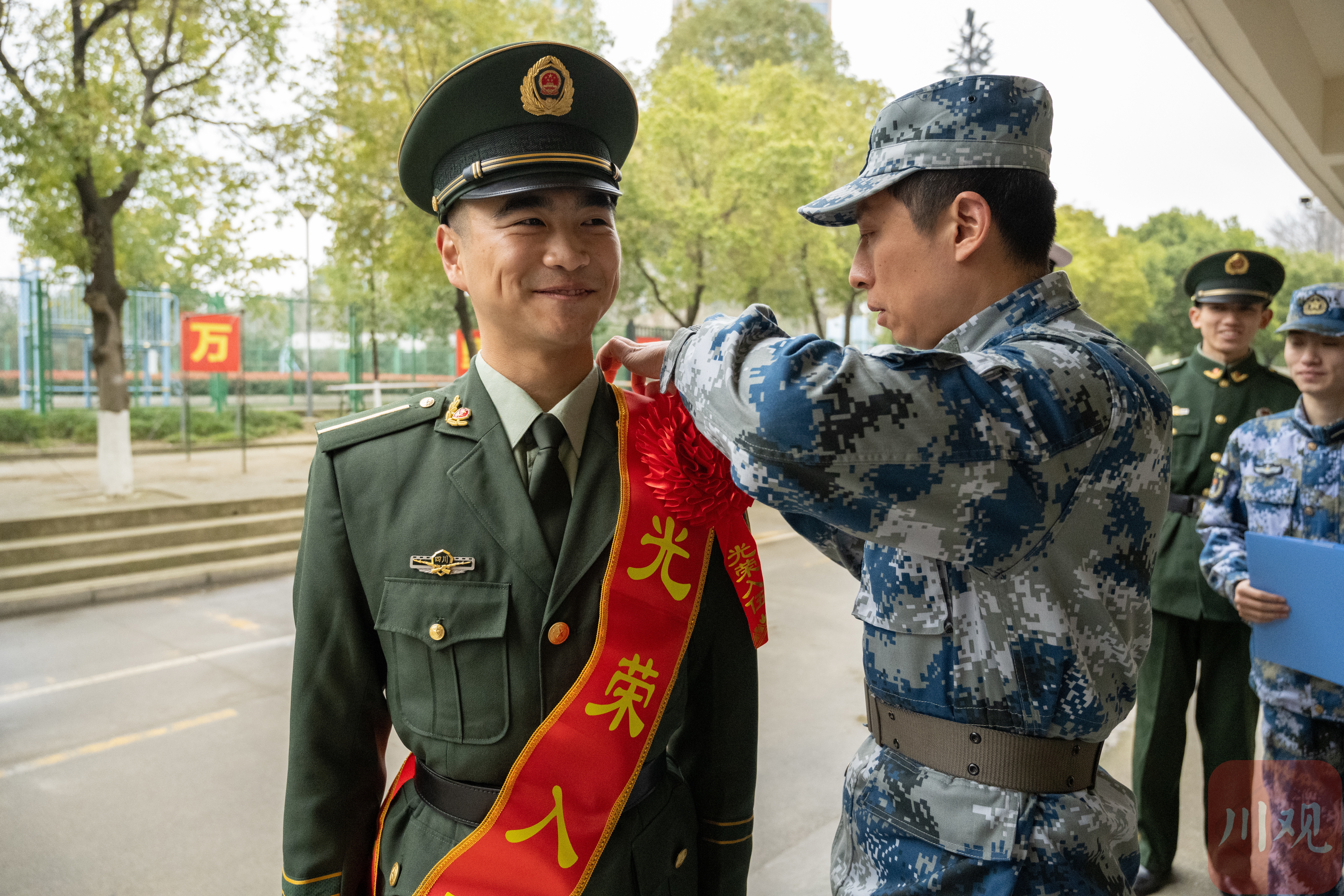 军地领导、教师和家长代表、2024级军士生代表为入伍军士生们整理戎装、佩戴绶带和红花。