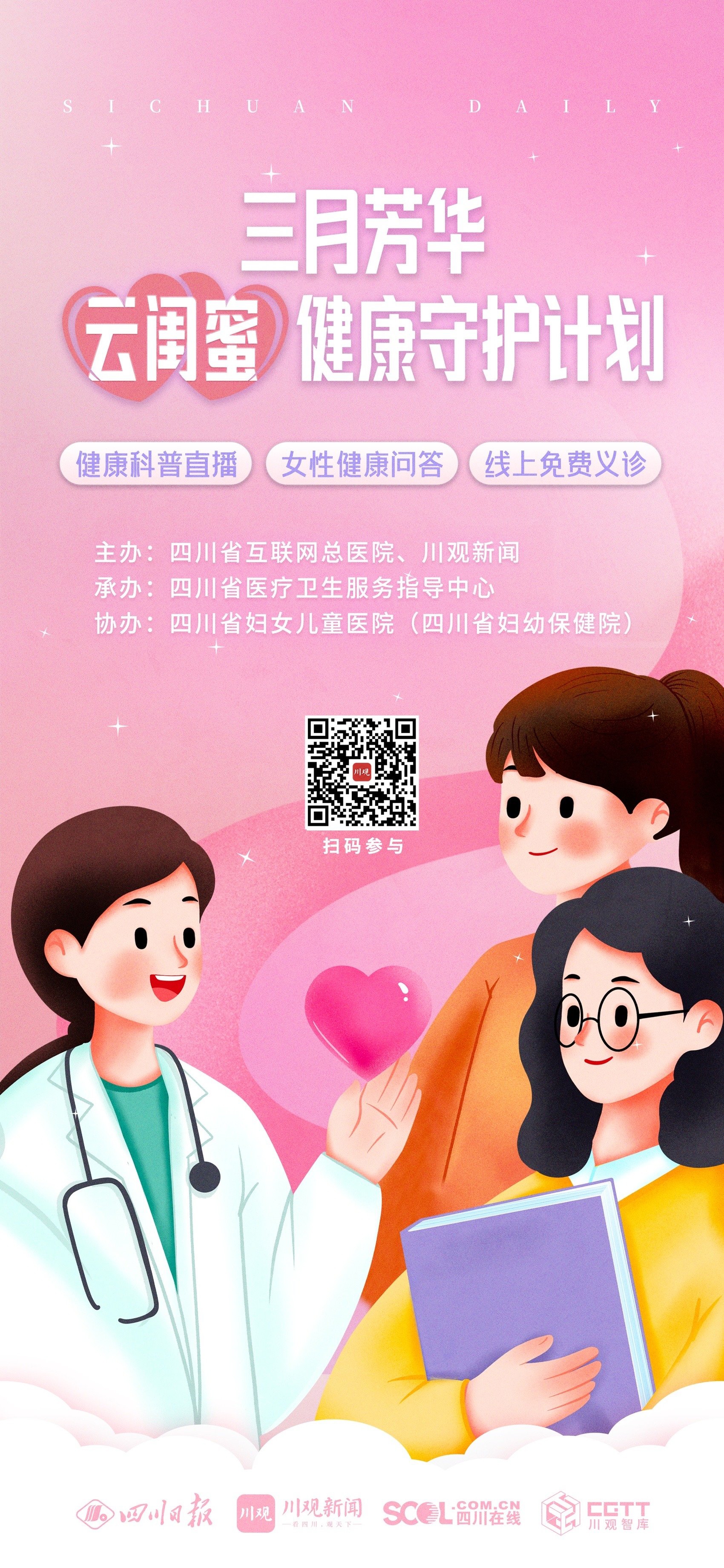 在义诊开始前,3月17日,四川省互联网总医院、川观新闻、四川省医疗卫生服务指导中心、四川省妇幼保健院联合推出“三月芳华,‘云闺蜜’健康守护计划”,开展健康科普直播、女性健康问答,一起守护女性身心健康。与专家交流女性健康热点问题,网友们还有机会获得直播专属义诊号源。直播时段在3月17日16:00—17:00,点击科普直播链接或下载川观新闻客户端观看科普直播;活动期间,点击活动链接进入活动专区,或扫描活动二维码进入活动专区,点击“科普内容”查看科普作品。