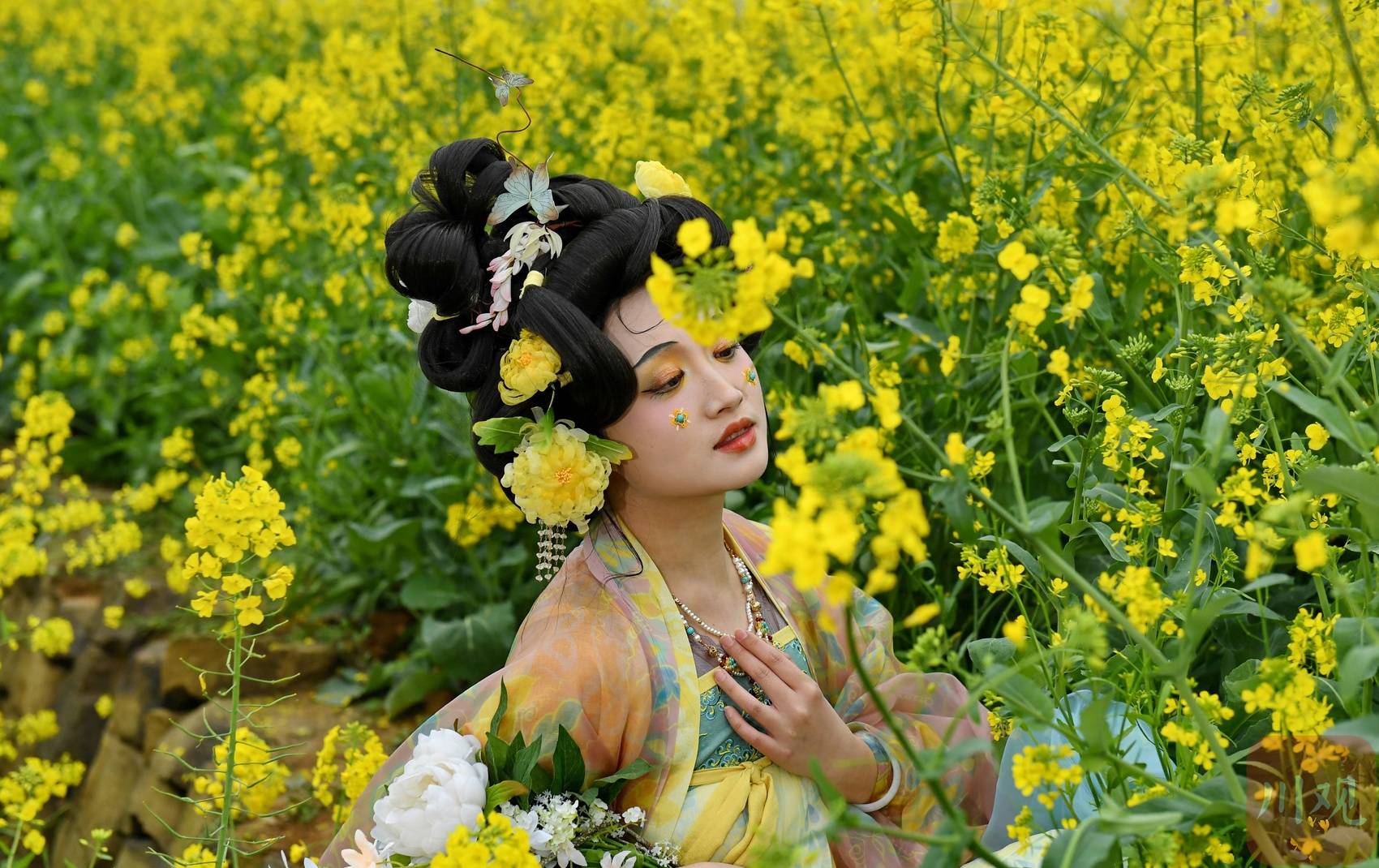 2025年3月15日,游客在成都市双流区黄水镇油菜花海里拍照留影。