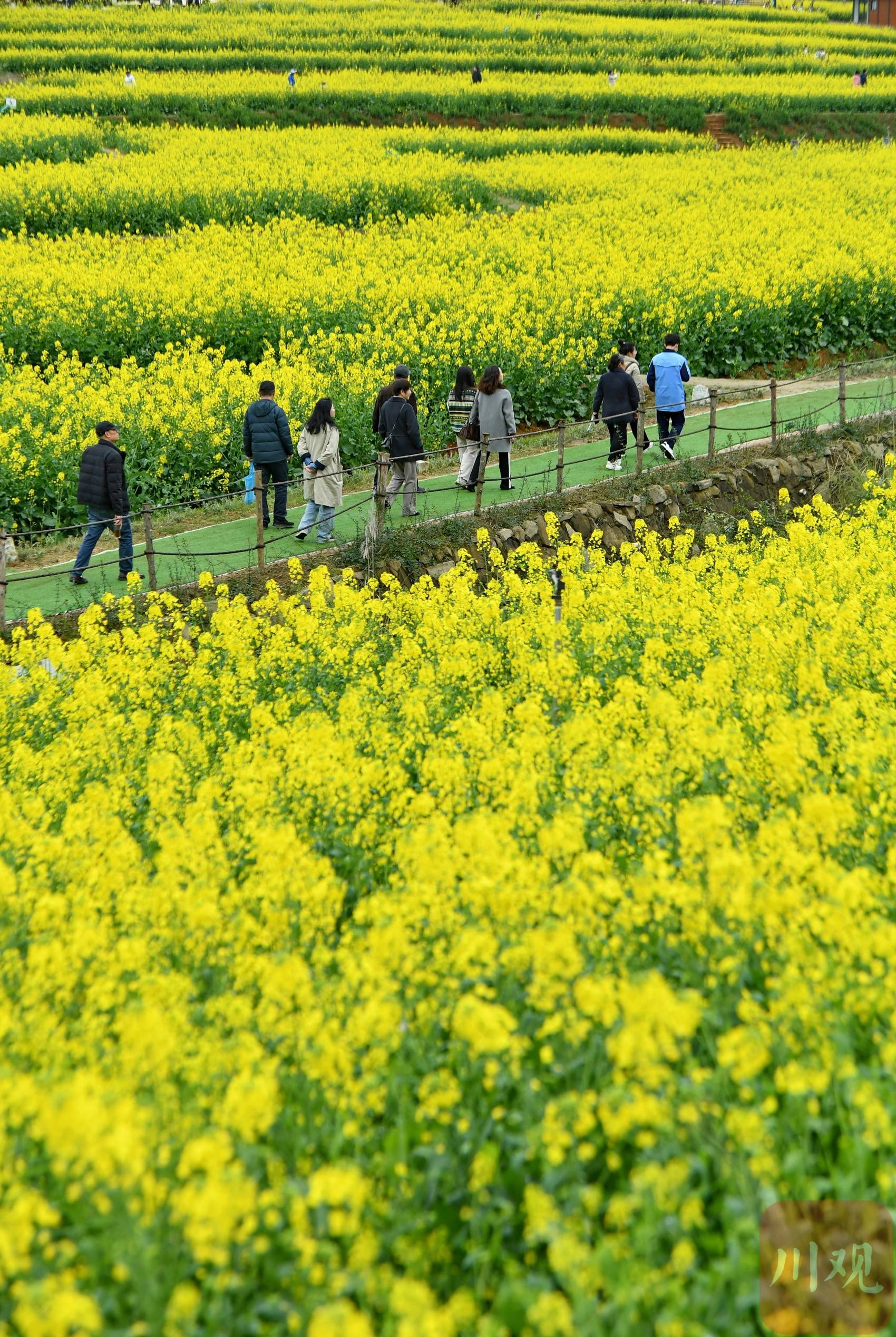 2025年3月15日,游客在四川省成都市双流区黄水镇油菜花海里游玩赏花。