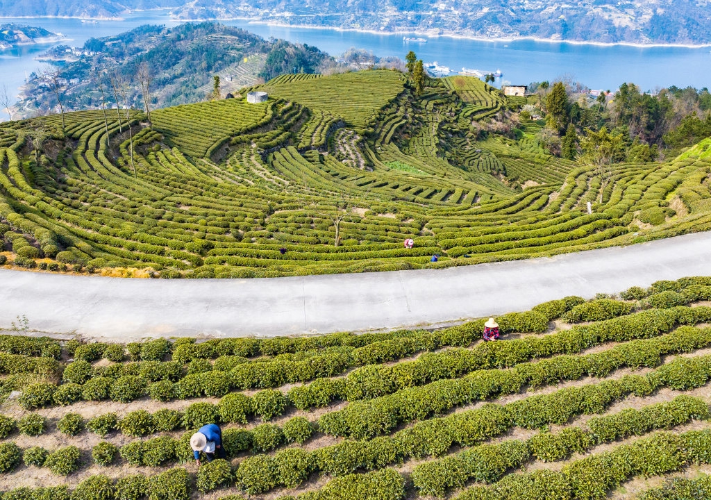 3月18日,湖北省宜昌市秭归县茅坪镇松树坳村村民在茶园采摘新茶(无人机照片)。