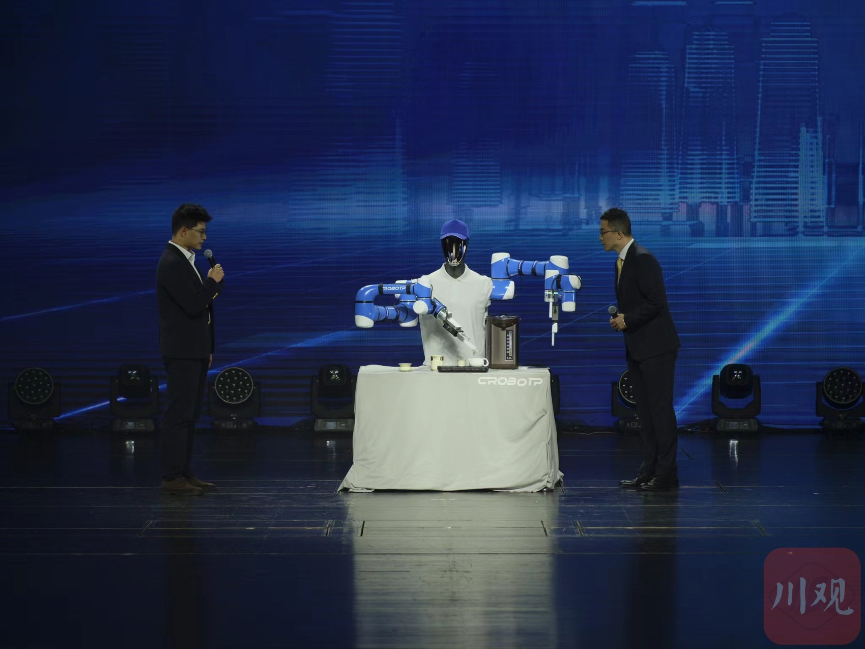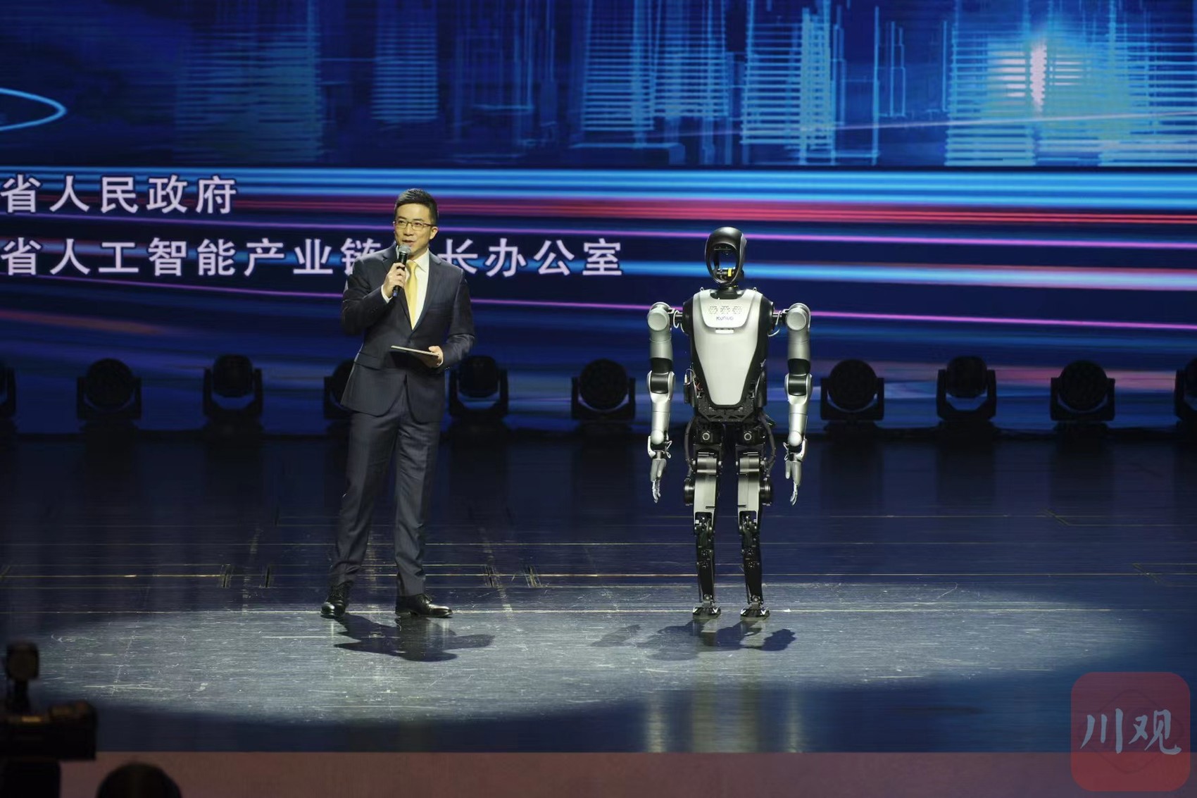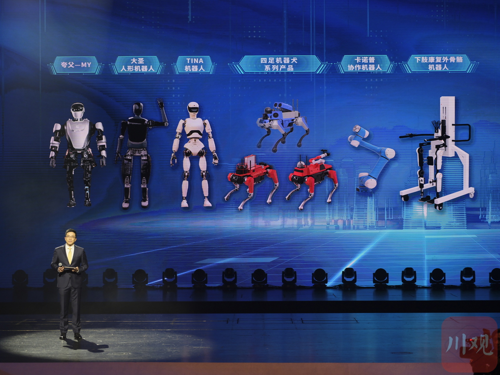 本次大会分为现场发布与AI场景展示两部分。其中,发布环节由夸父机器人主持,通过现场演示、成果展示、专家点评等方式,集中发布和展示一批“四川造”智能机器人和大模型产品。