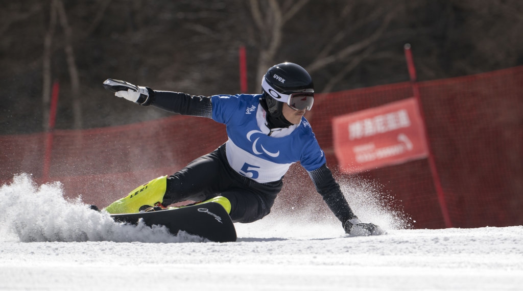 当日,中华人民共和国第十二届残疾人运动会暨第九届特殊奥林匹克运动会单板滑雪比赛在河北省张家口市崇礼区多乐美地滑雪场开赛。