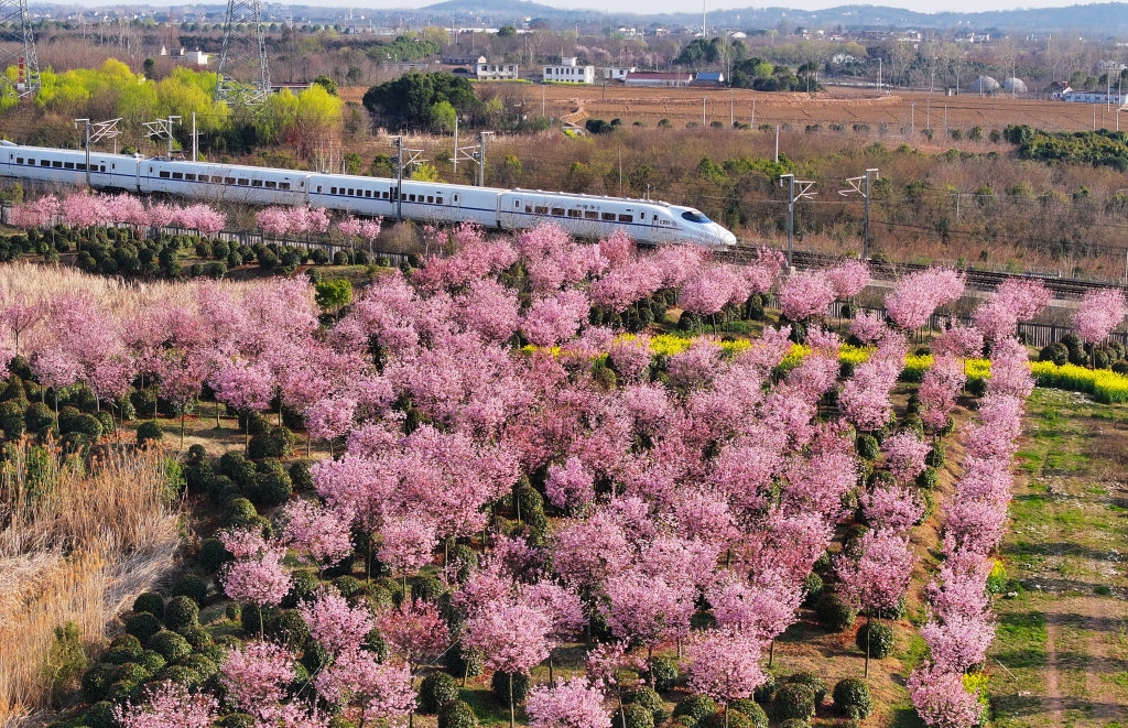仲春时节,安徽省合肥市肥东县长临河镇合福高铁沿线樱花盛放,疾驰的列车与粉白相间的“樱花海洋”相映成趣,绘就生机勃勃的春日图景。