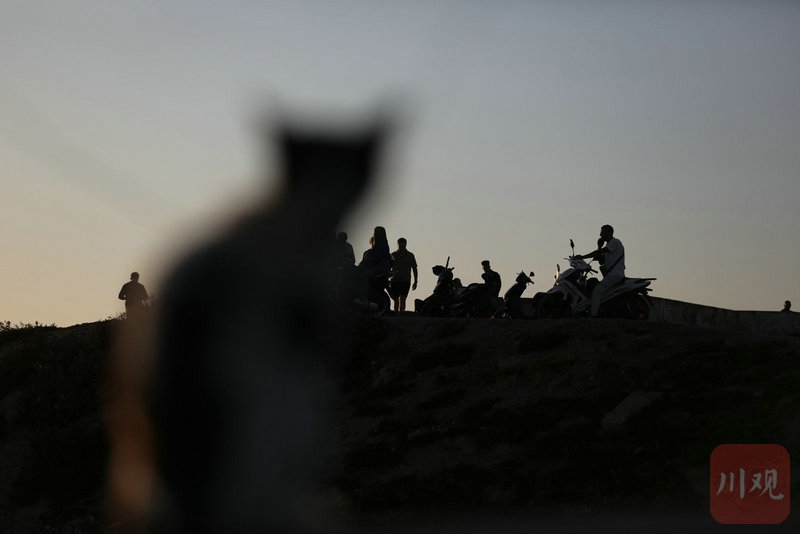 卡萨布兰卡的大西洋边,一只流浪猫与远处正观赏日落的年轻人构成了一幅独特的画面。
