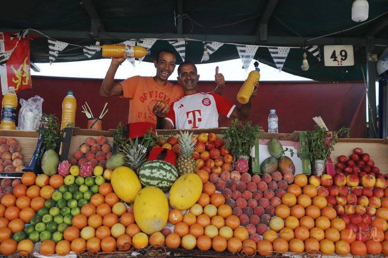 马拉喀什的贾马夫纳广场,两位笑容满面的水果商贩。