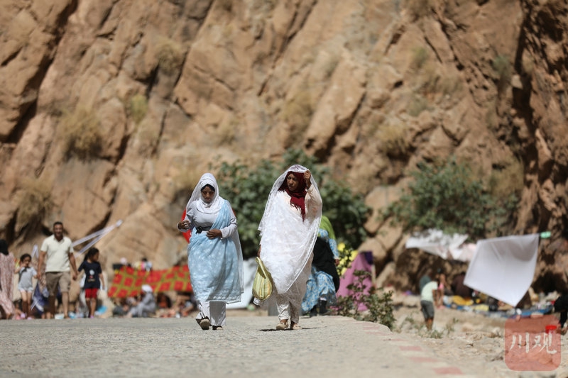 阿特拉山区的道路上,两位身着传统服饰的妇女。