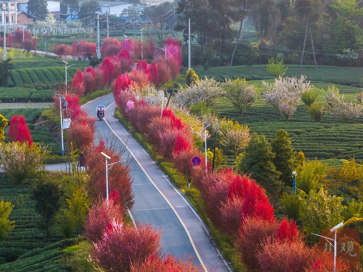 3月27 日,雅安市名山区的中国至美茶园绿道沿线,茶树泛绿、花朵绽放,处处呈现出一片生机盎然的景象。