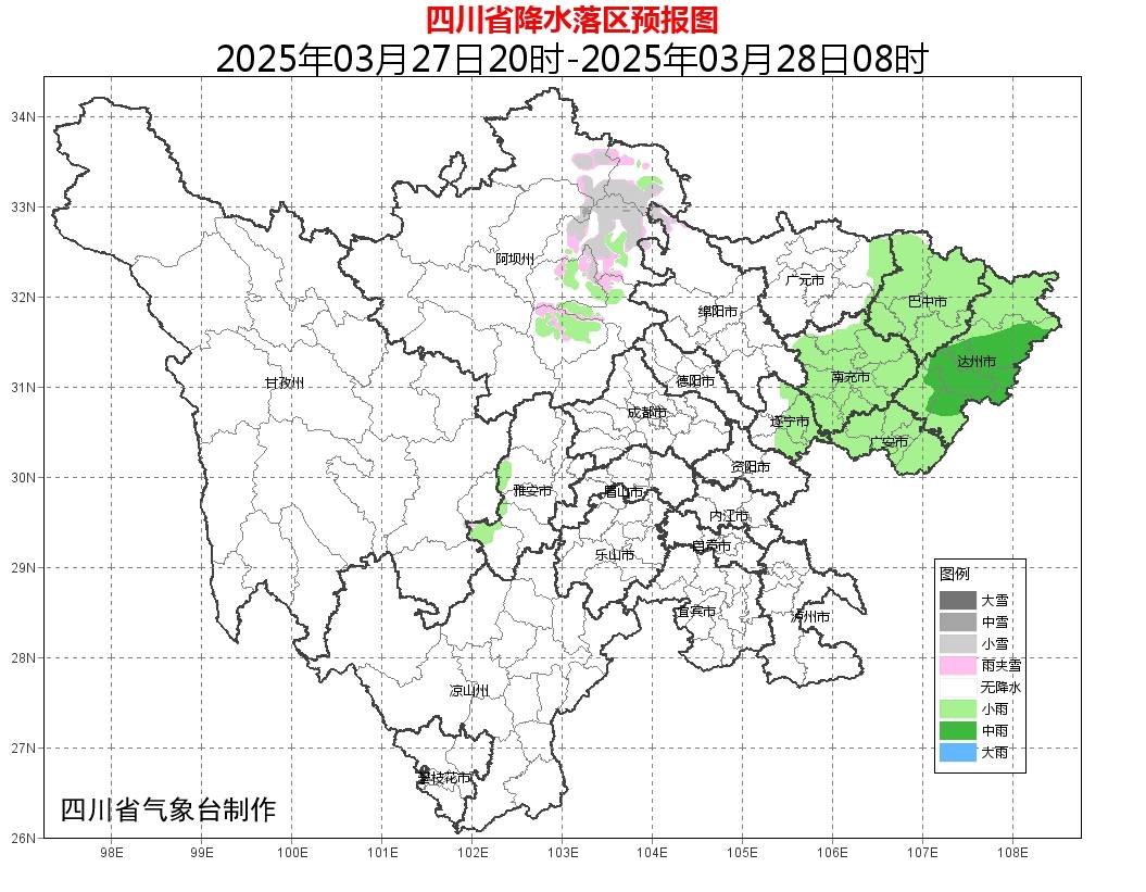 今天晚上: 盆地大部多云,普遍有4~6级偏北风,北部中部部分地方风力可达7~8级,局部9级,其中巴中、达州、南充、广安、遂宁5市阴天间多云有阵雨或雷雨,局部中雨;川西高原大部和攀西地区晴间多云,阿坝州东部多云间阴有阵雪(雨)。