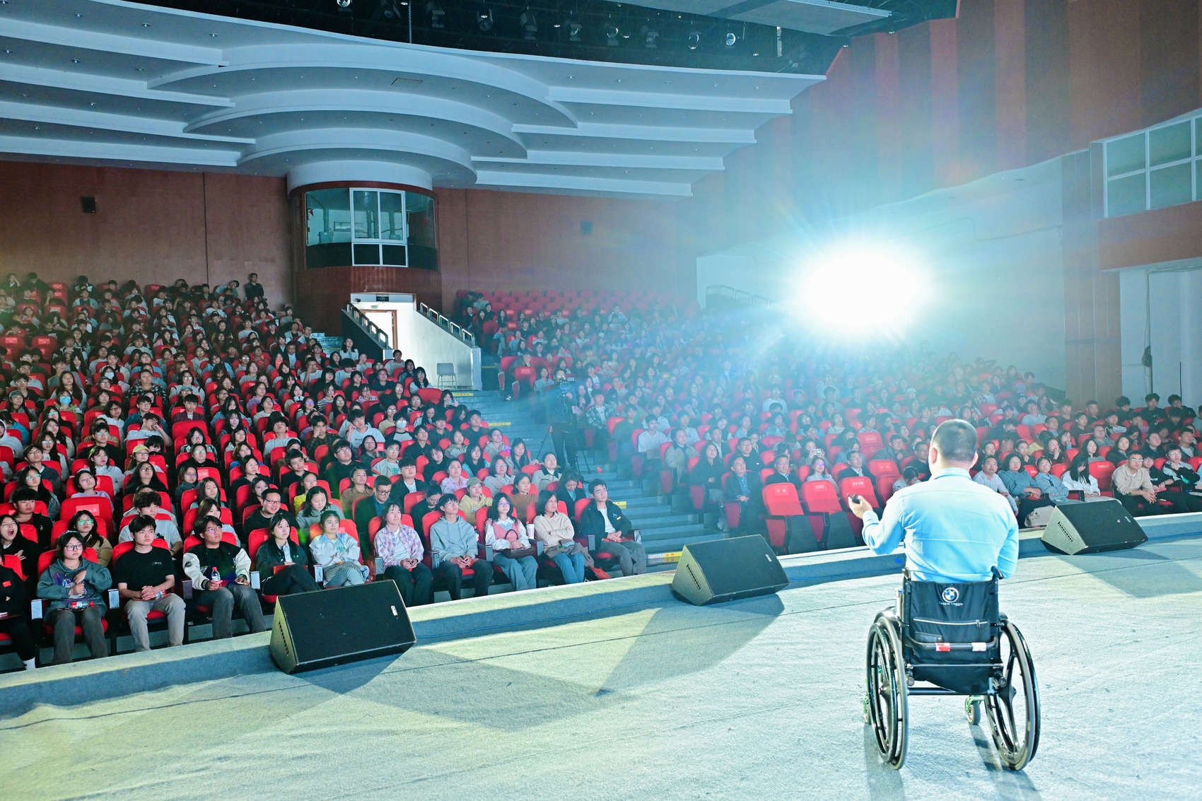 四川残疾人励志报告团成员代国宏、彭超、博史尼撒和四川大学青春励志宣讲团成员粟秋滔、杜宇翔以及四川旅游学院教师陈超分别分享了自己的励志故事。“听完这场宣讲,我内心久久不能平静,他们自强不息的精神深深震撼了我,我会带着这份感动与力量,积极面对人生中的各种挑战,勇敢追逐属于自己的梦想!”四川旅游学院会展经济与管理专业学生冯紫涵激动地说。