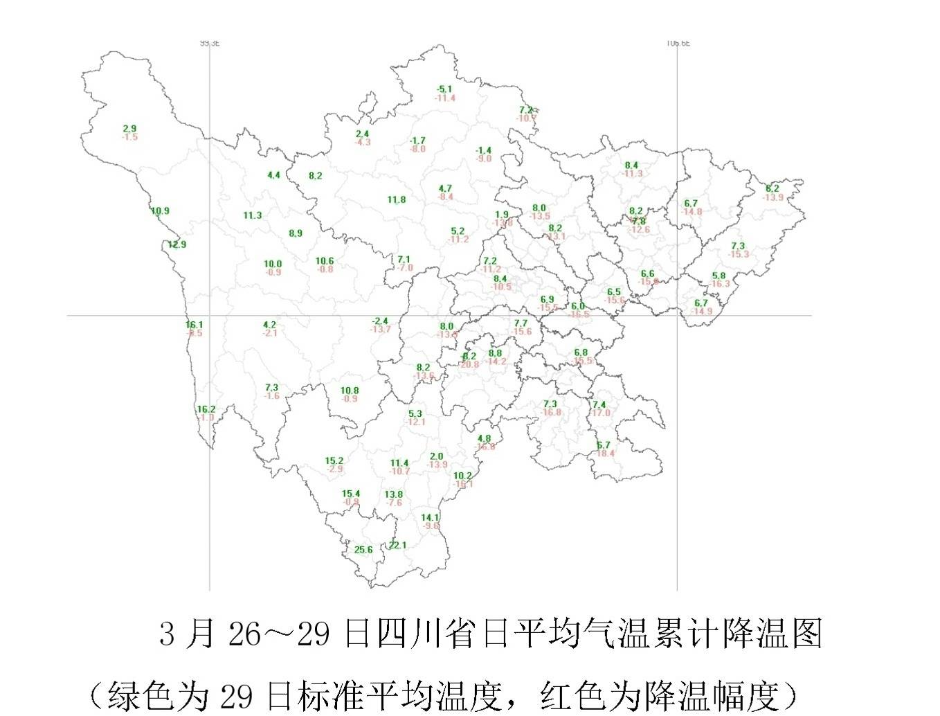 气象监测显示,本次过程最强降温时段出现在3月27日至29日,盆地西部和凉山州东部及甘孜、阿坝2州东部的日平均气温普遍下降了8~13℃,盆地东部降幅普遍为14~17℃,全省最大降温幅度出现在仪陇、叙永,分别为19℃和18.4℃。盆地日平均气温从26日的20~24℃下降到29日的6~9℃,日最高气温从26日的30~34℃下降到29日的8~11℃。