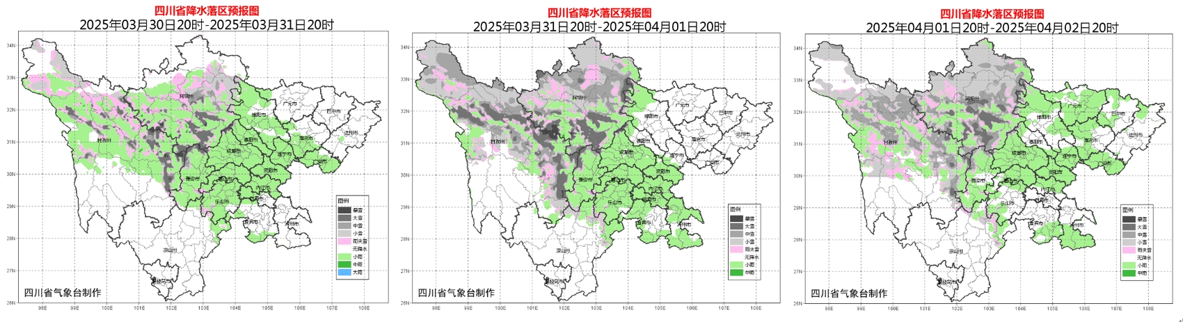 四川省气象台预计,3月30日20时至4月1日,盆地各市以阴天间多云天气为主,川西高原大部和凉山州东北部有阵雪(雨),其中甘孜州北部东部、阿坝州中部南部部分地方有中到大雪,局部暴雪。