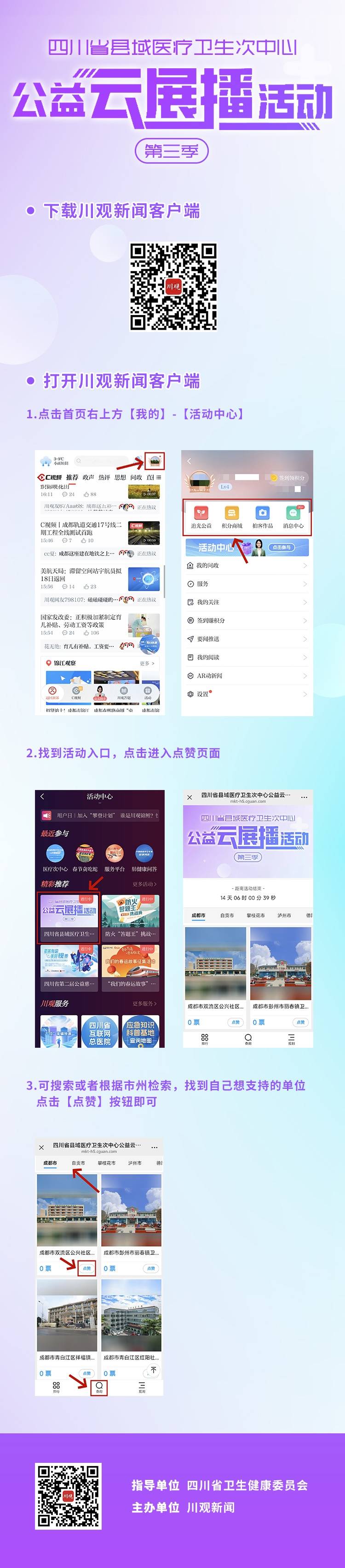 由省卫生健康委、川观新闻联合开展的“四川省县域医疗卫生次中心公益云展播活动”(第三季)正在火热进行中,快来为你认可的县域医疗卫生次中心点赞吧!