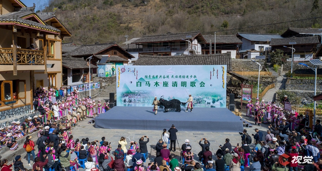 4月4日,绵阳市平武县木座藏族乡民族村老寨子,一年一度的白马木座清明歌会在这里举行。(C视觉 杨建 摄)