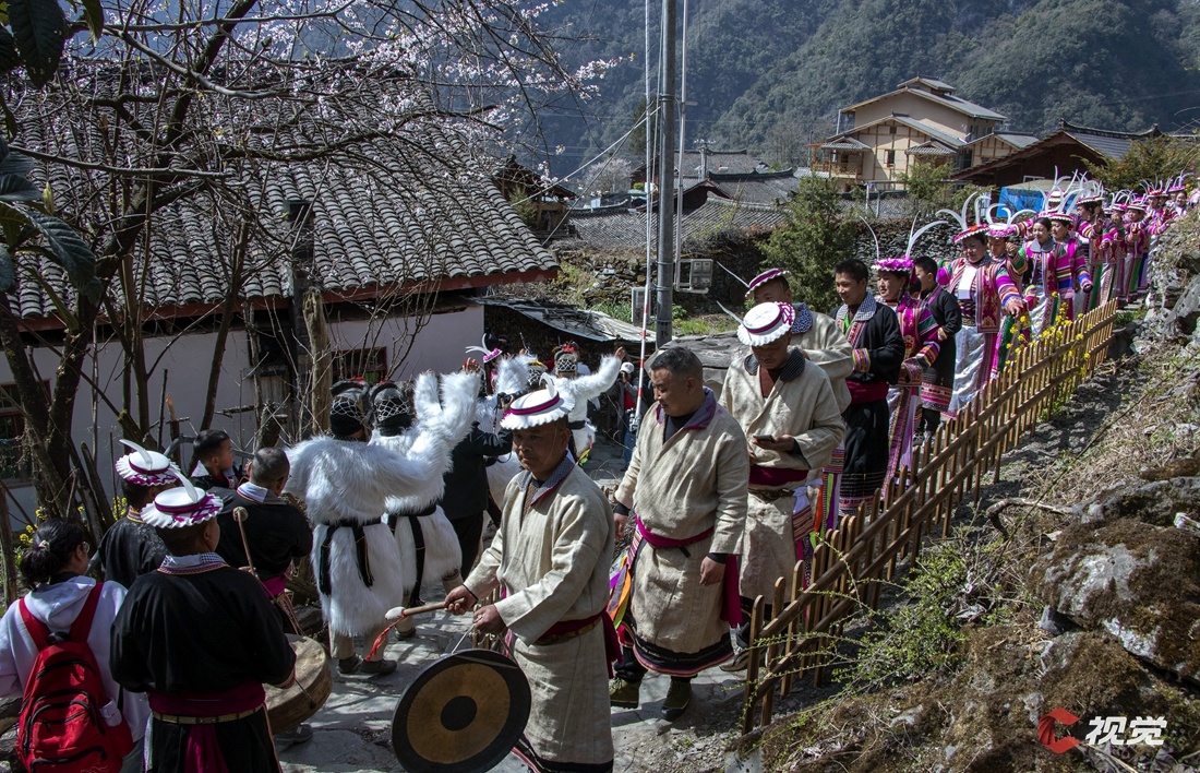4月4日,绵阳市平武县木座藏族乡民族村老寨子举行了白马木座清明歌会。图为民俗巡游队在寨子里边走边唱,祈求风调雨顺。(C视觉 杨建 摄)
